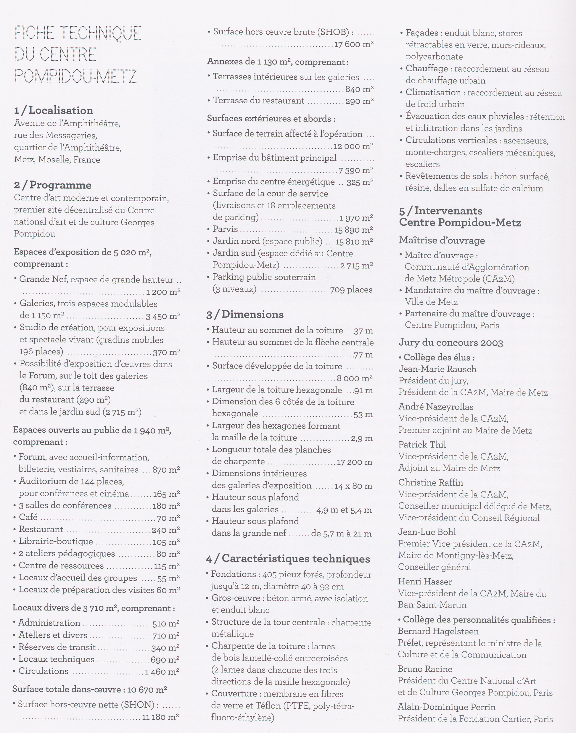Galerie = parallélépipède de 85 m de long, sur 15 m de large et 7 m de haut, en plan libre (sans aucun élément porteur dans l’espace d’exposition, qui peut donc être aménagé par des cimaises sans contraintes architectoniques).